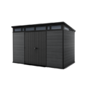 The Keter 11’x 7′ Cortina Heavy Duty Plastic Pent Shed – Dark Grey is modern in every way. With a slanted roof above a band of windows, it boasts a sleek, contemporary design that stores your belongings in eye-catching style. Its double layered walls are made from Evotech, our innovative composite material that gives you the aesthetic look and feel of wood but with the benefits of resin.